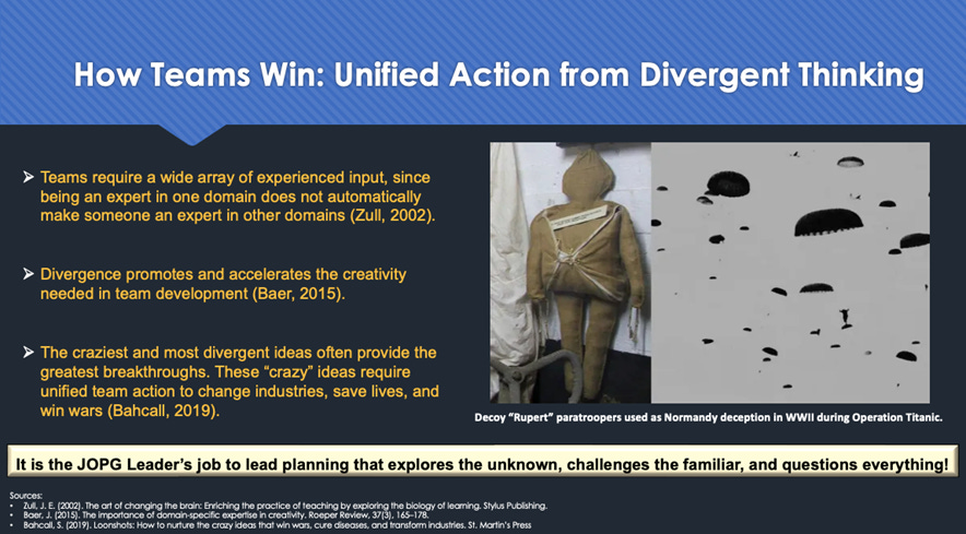 As seen in the following image, an excerpt from my JOPGLWS guided discussion on Critical & Creative Thinking Techniques, I coach leaders to empower a winning culture of teamwork by engaging curiosity and energizing creativity.
